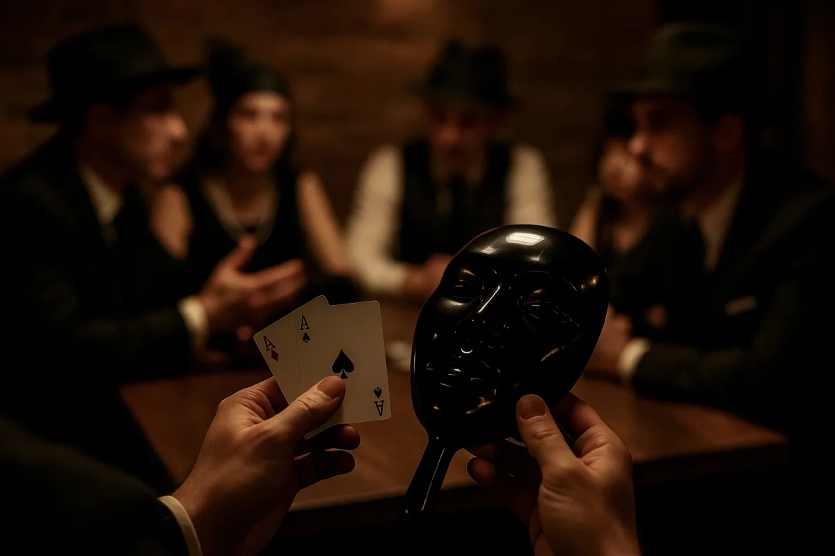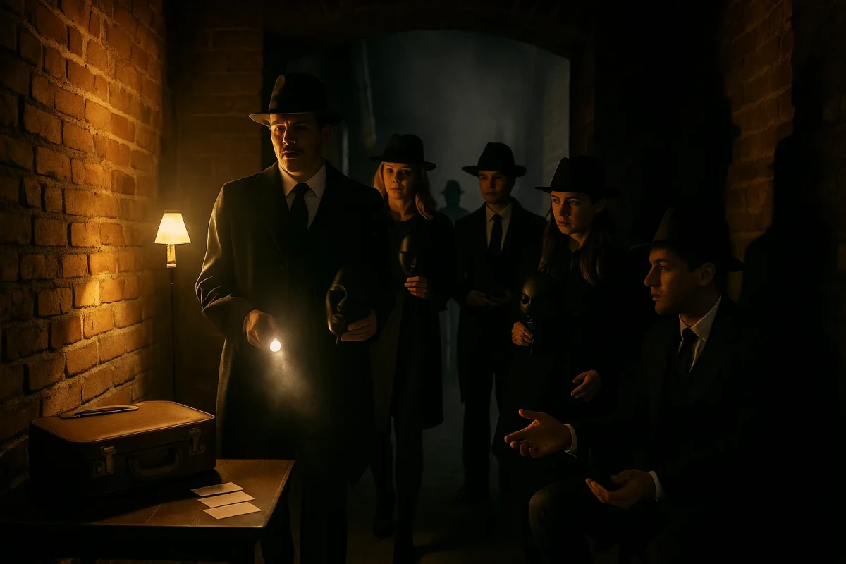 Реквизит: пистолеты-реплики, папки с «секретными материалами», старинные чемоданы, плащи, шляпы, неоновая вывеска «SPEAKEASY». - Механика ролей и предательства