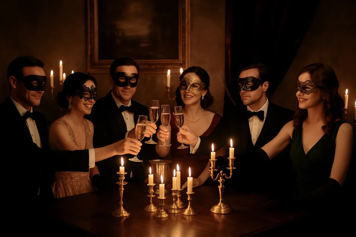 Представьте: старинный особняк, приглушённый свет, джазовые аккорды, винтажные костюмы, маски, бокалы в тонком стекле и лёгкое напряжение в воздухе.