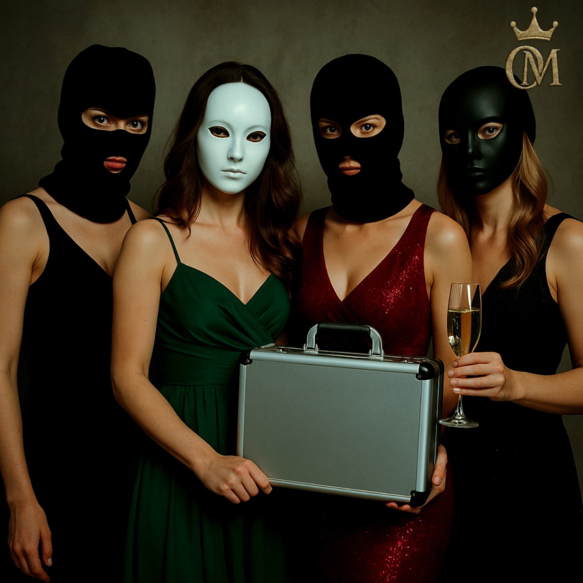 - Стильный реквизит: сейф, план ограбления, фальш-деньги, досье, маски